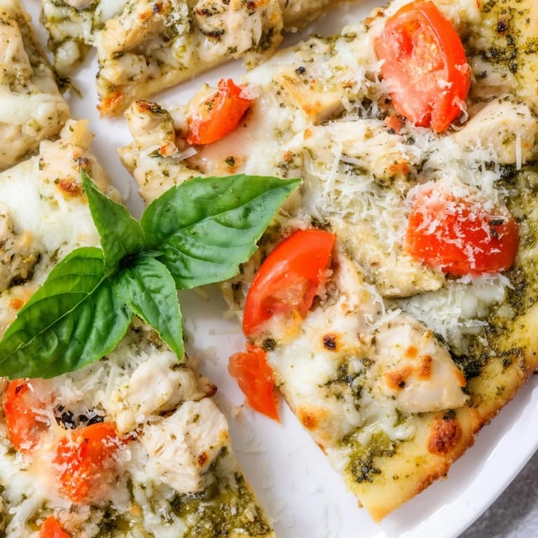 Save The smell of basil and garlic hit me the second I opened the jar of pesto, and I knew this pizza was going to be different. I'd been making the same red-sauce pizzas for months, and honestly, I was bored. A friend mentioned tossing leftover chicken on a pesto base, and I figured why not try something green for once. The crust crisped up beautifully, the chicken stayed tender, and those tomato slices softened just enough to release their juices into every bite.