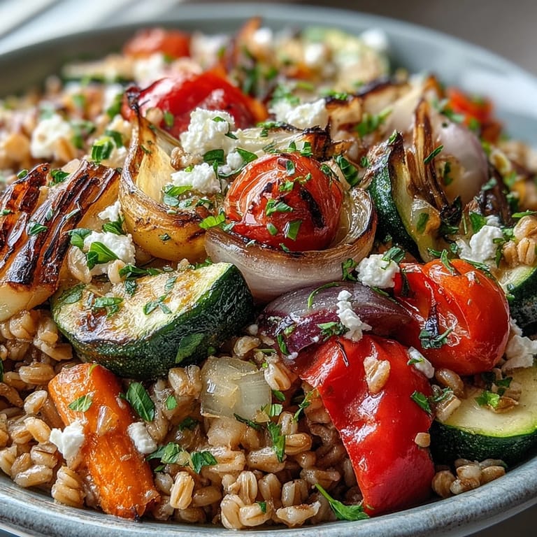 Save This Farro with Roasted Vegetables is a hearty and wholesome dish featuring chewy whole grain farro tossed with a medley of caramelized, oven-roasted vegetables. Perfect as a main or side, this meal brings together the earthy flavors of the Mediterranean in a way that is both satisfying and easy to prepare.