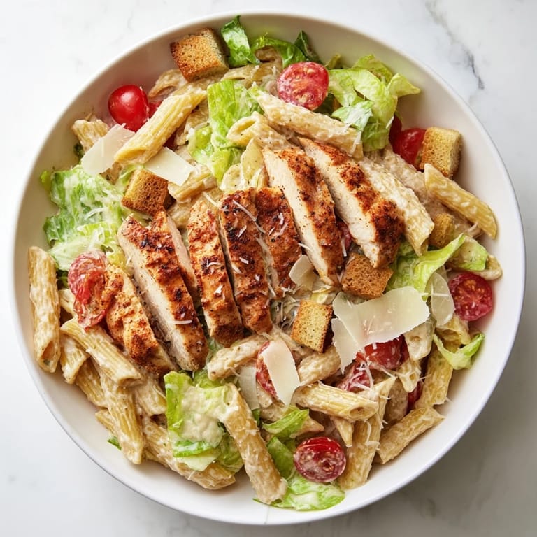 Save My neighbor knocked on the door one July evening holding a platter of leftover grilled chicken and asked if I had anything to do with it. I had pasta, some wilted romaine I was about to toss, and a jar of Caesar dressing. What came together in the next twenty minutes turned into our go-to when we're too hungry to wait but want something that feels like effort. The heat from cayenne against the cool, creamy dressing just works.